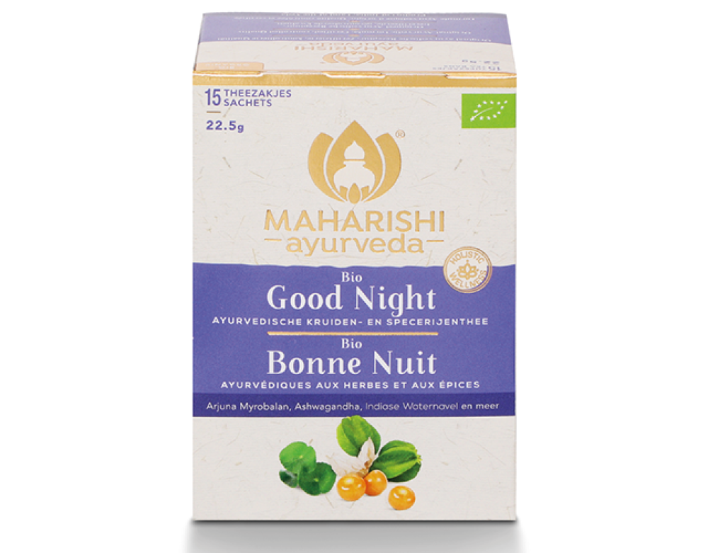 Good Night-thee van Maharishi Ayurveda bevat zorgvuldig geselecteerde ayurvedische kruiden en specerijen zoals zoethout, winterkers (ashwagandha), groene munt, kardemom, koriander, pepermunt, brahmi, fenegriek, peper en galanga. Vanwege zijn stressverminderende eigenschappen wordt de winterkers al lange tijd gewaardeerd in de ayurveda.