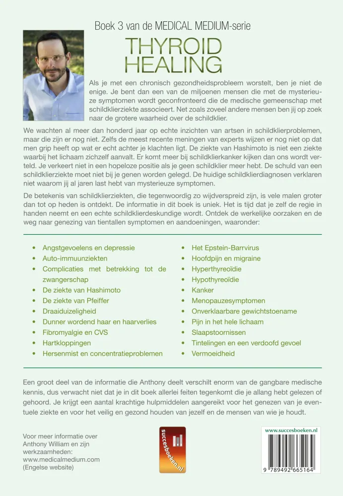 Met het derde boek van Medical Medium Anthony William wordt je zelf een echt schildklierdeskundige. Miljoenen mensen over de hele wereld hebben te maken met de mysterieuze symptomen die worden geassocieerd met schildklierziekte. De huidige schildklierdiagnosen verklaren niet waar deze symptomen vandaan komen. Anthony William gaat uitgebreid in op de betekenis van schildklierziekten die tegenwoordig wijdverspreid zijn en vele malen groter dan tot op heden zijn ontdekt.We wachten al meer dan honderd jaar op echte inzichten van artsen in schildklierproblemen, maar die zijn er nog niet. Zelfs de meest recente meningen van experts wijzen er nog niet op dat men grip heeft op wat er echt achter de klachten ligt. De ziekte van Hashimoto is bijvoorbeeld niet een ziekte waarbij het lichaam zichzelf aanvalt en er komt meer bij schildklierkanker kijken dan ons wordt verteld. Ook wanneer je geen schildklier meer hebt verkeer je niet in een hopeloze positie. Schildklierziektes zijn niet de schuld van de genen.