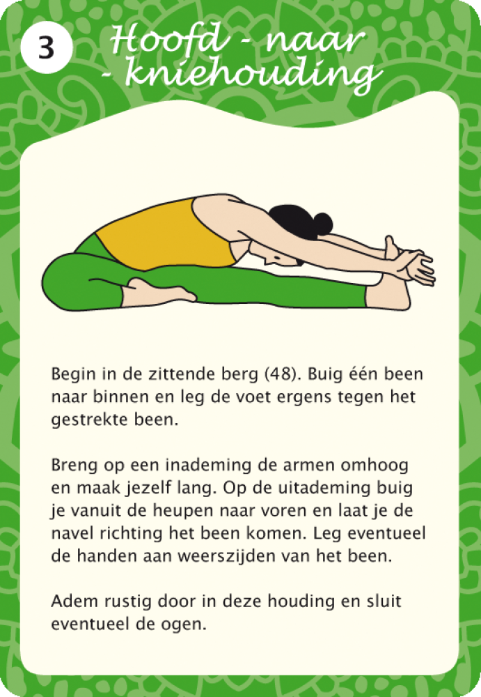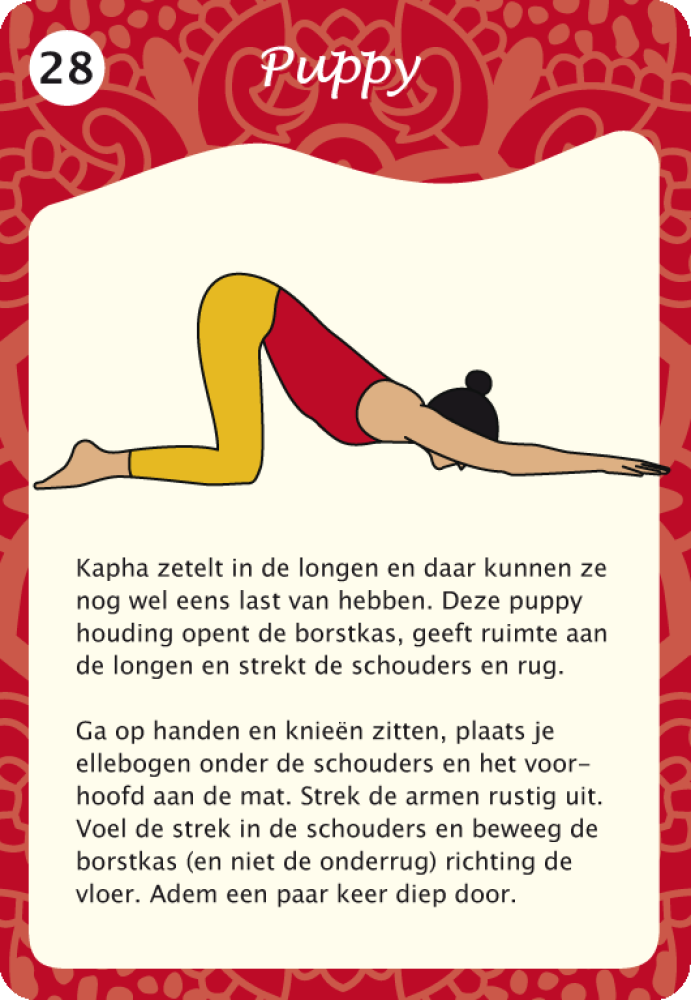 De kleuraanduiding van de kaarten geeft in één oogopslag aan voor welk Dosha de houding het meest geschikt is.Je ontvangt